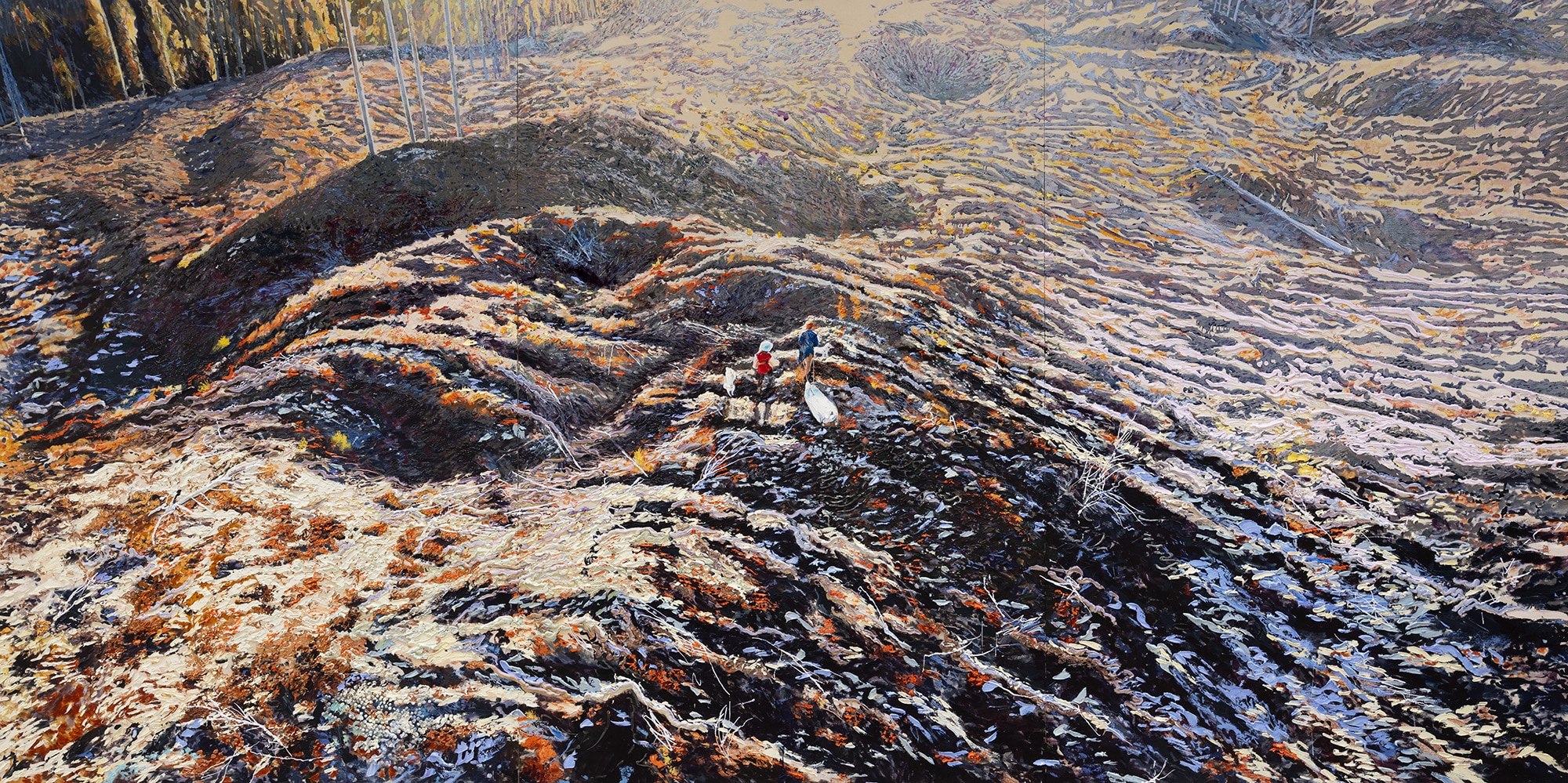 Sara-Vide Ericsons figurativa måleri hämtar inspiration från hennes närmiljö i Hälsingland. Hennes bilder skildrar myrar, vattendrag, skogar och dalar – ett landskap som sammanflätas med egna levda erfarenheter. Genom en performativ arbetsprocess gestaltar hon olika karaktärer och iscensätter verken innan de målas på noggrant utvalda platser.